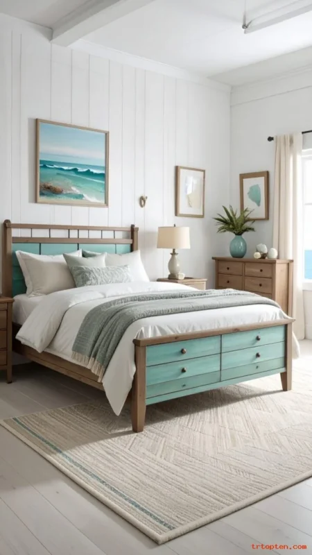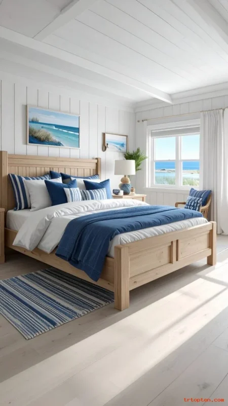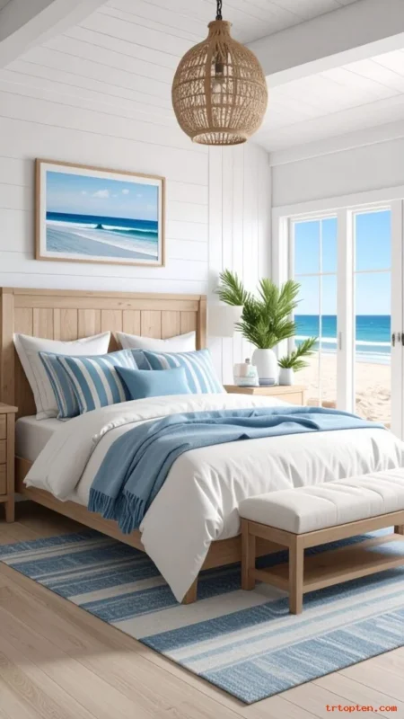 How do I style a beach cottage bedroom? Start with white bedding, then add blue layers and simple stripes. Use light wood furniture and soft lighting for comfort.