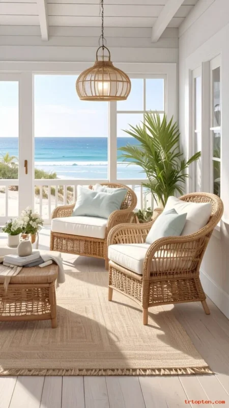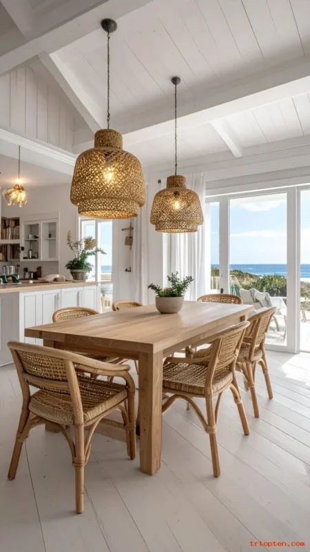 Use wicker chairs, rattan side tables, or cane cabinet doors. These textures add instant beach cottage charm.