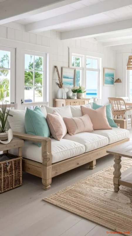 Add pastel touches like blush, pale aqua, or soft yellow in pillows and art. Keep pastels muted so they feel sun-faded.