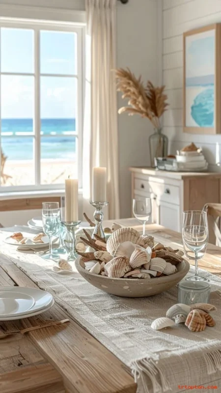Use a simple bowl with shells, driftwood, or sea glass. Keep it low so people can talk across the table.