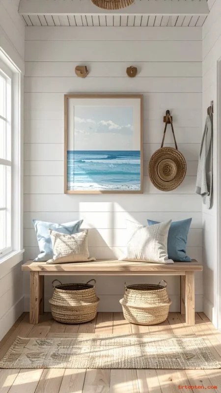 Use baskets under the bench for extra storage. This keeps clutter off the floor and makes the entry feel calm. Add a simple coastal print above the hooks. A clear entryway makes the whole home feel better.