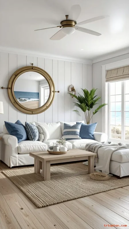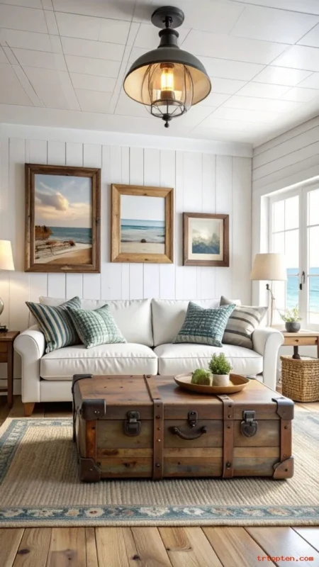 Keep lighting shapes simple and clean. This avoids a heavy nautical look. Add a table lamp with a ceramic base in white or sand tones. Light layers help the cottage feel welcoming.