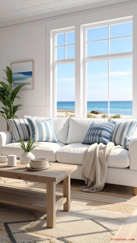 Add striped pillows for a coastal hint without heavy theme decor. Keep stripes simple in blue, gray, or tan. Use a soft throw at the arm of the sofa for comfort. This setup works well for sandy feet and family visits.