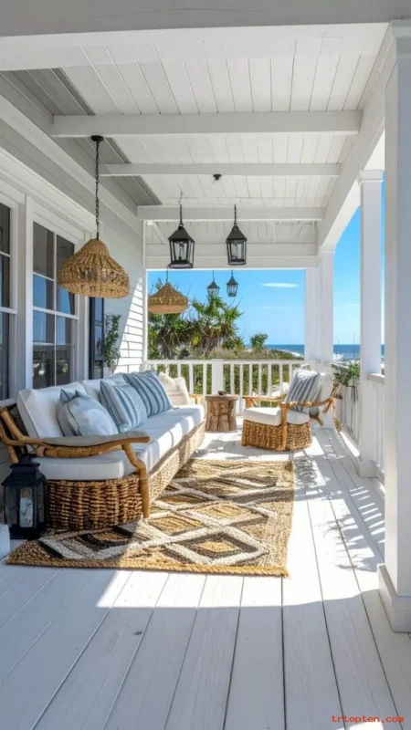 Set up a porch or patio with simple outdoor seating. Use white cushions and striped pillows for a beachy look.