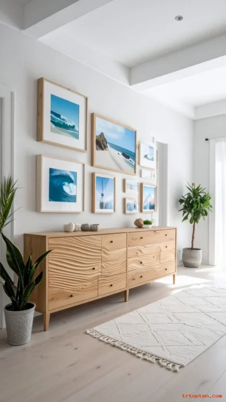 Create a gallery wall with beach photos, maps, and simple line art. Use light wood or white frames to keep it cohesive.