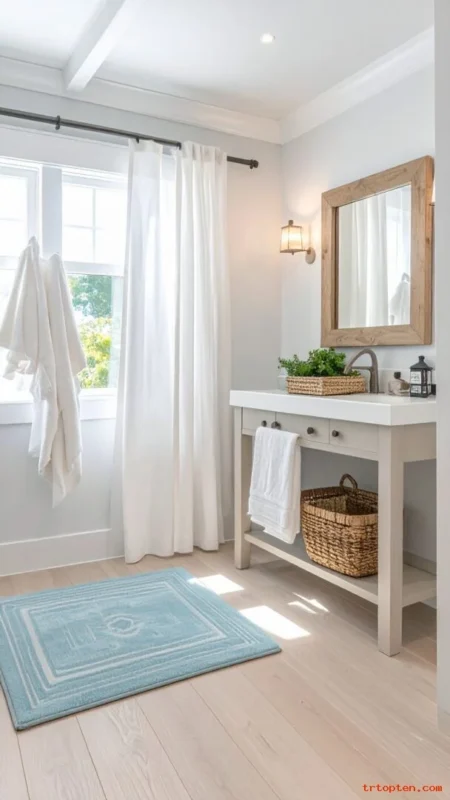 Choose a shower curtain with subtle stripes or a clean solid color. Keep patterns light and easy to match. Use a mirror with a white or natural wood frame. This keeps the bathroom bright and cottage-like.