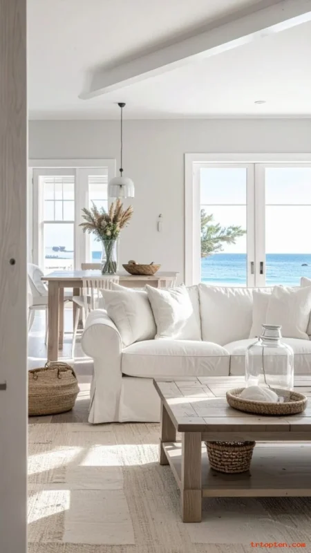 Coastal decor feels light, fresh, and relaxed. Behind-couch styling can support that calm vibe.
