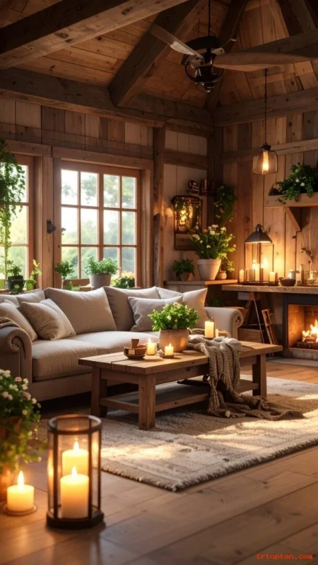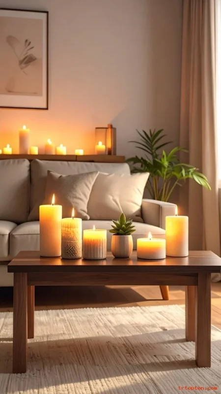 Candles add an easy glow and make the living room feel relaxing. A row of candles looks clean and modern.