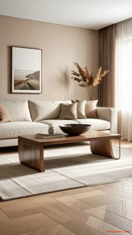 Add a small coral-style sculpture or driftwood accent. Keep the palette soft with whites and sandy beiges. Use a woven basket underneath for texture.
