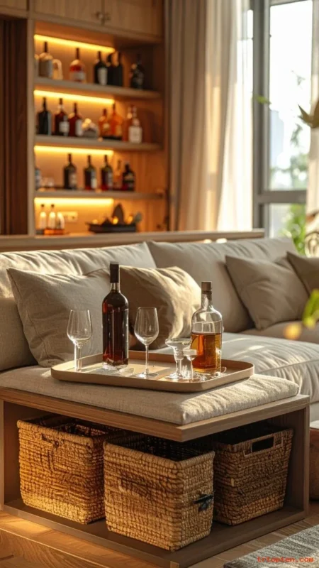 A sofa table can hold a small bar area for entertaining. It keeps drinks close without taking over the room.