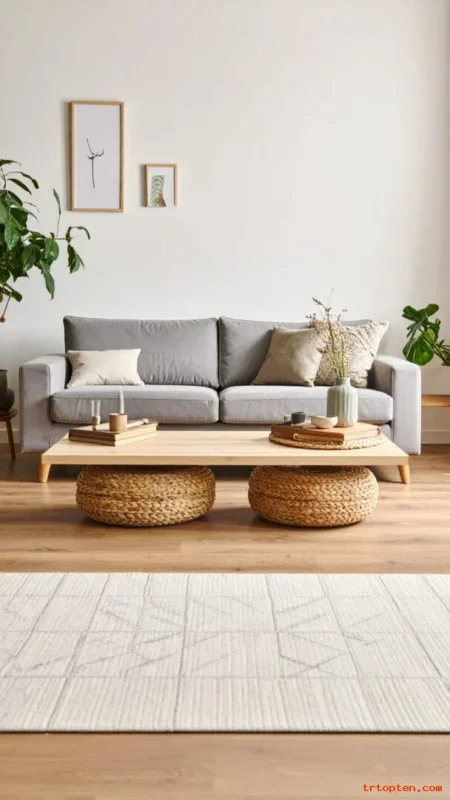 Use baskets with handles for quick access. Match the basket tone to your rug or wood furniture.