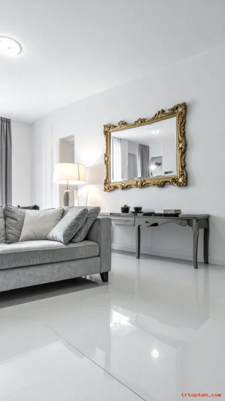 Hang a large mirror centered behind the table. Choose a frame that matches your room’s metal or wood finishes. Keep tabletop decor simple so the mirror stands out. Add a lamp to double the glow in reflection.