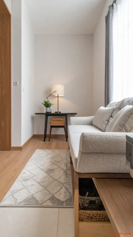 A slim sofa table saves space behind a tight sofa. Minimal decor keeps the walkway clear.
