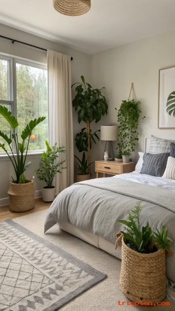 Use grey planters or beige baskets for plant pots to match the palette. Place one tall plant in a corner and one small plant on a nightstand. This adds balance without clutter.