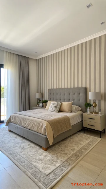 Use beige and grey stripe wallpaper on one wall to add pattern. Keep the other walls plain beige to avoid visual noise. The stripes help the room look taller and cleaner.