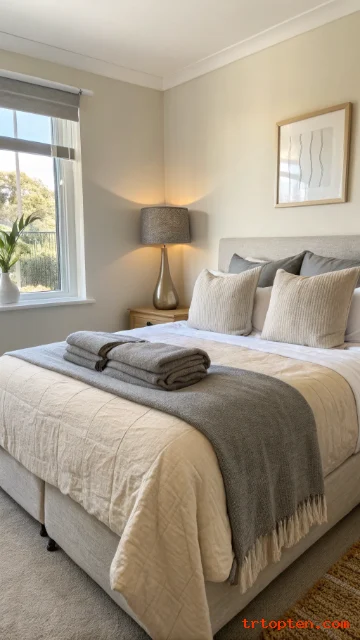 Make the bed look styled with a beige base layer and a grey top layer. Use a beige quilt and fold a grey blanket across the middle. This adds contrast without needing bold colors.