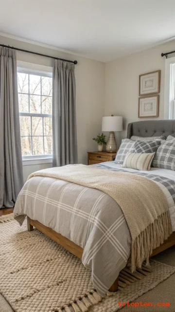 Choose bedding in light greys and warm whites for a fresh feel. Add a beige wool throw for softness. The palette stays calm and easy to live with.
