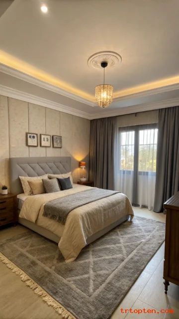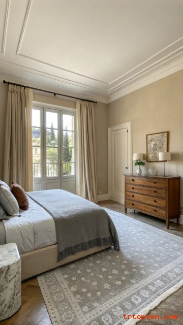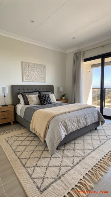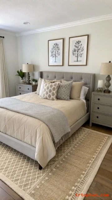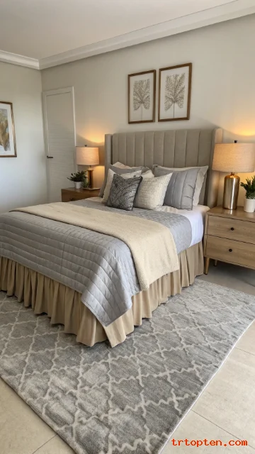 Choose a beige rug centered under the bed. Keep decor balanced with equal items on each side. The room will feel restful and polished.