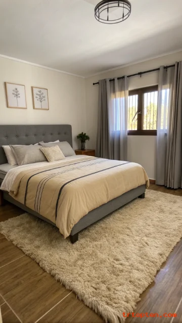 Use a beige shag rug to add softness and comfort. Pair it with a grey bed frame for a strong outline. This contrast makes the bed feel like a centerpiece.