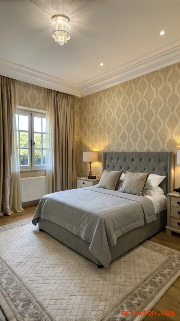 Use beige wallpaper with a subtle pattern for warmth. Pair it with grey bedding sets for contrast and calm. A soft pattern adds interest without noise.