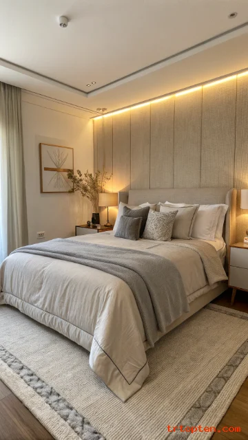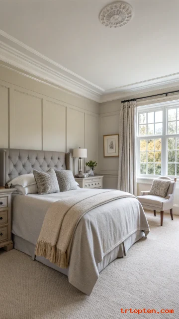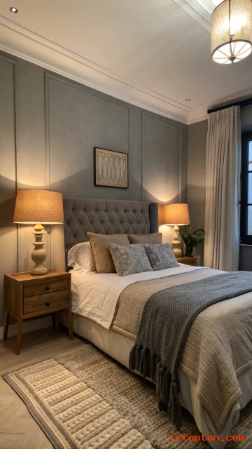 Add grey wall paneling behind the bed for structure. Use beige decor items like pillows, throws, and baskets to soften the look. The paneling gives the room a tailored feel.