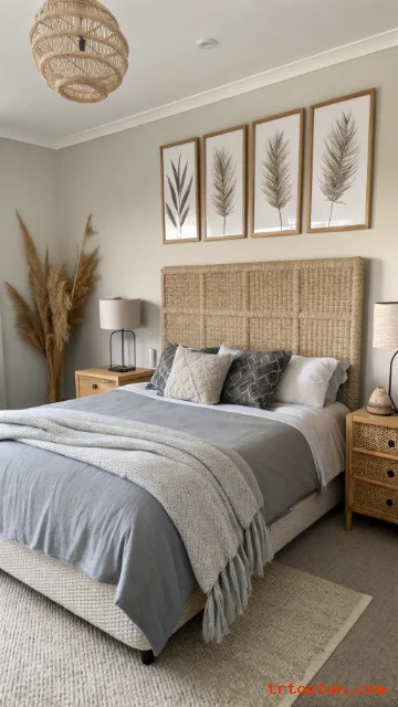 Choose a beige woven headboard for texture and warmth. Pair it with grey bedding for a clean and calm finish. The woven detail adds interest without loud patterns.