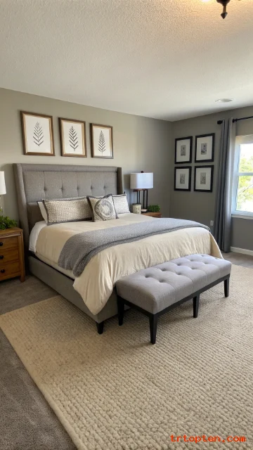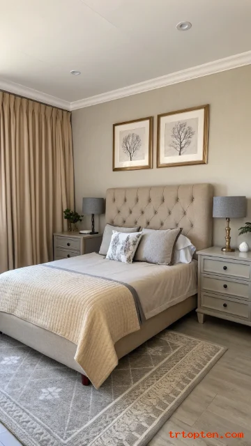 Paint the walls in greige to blend beige warmth with grey calm. Add a beige upholstered headboard to make the bed feel soft and cozy. This combo works well in both small and large rooms.