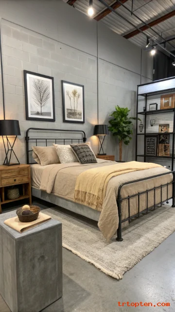 Use grey walls or grey bedding as the base. Add beige textiles to soften the room and keep it comfortable. Then add small metal details for an industrial edge.