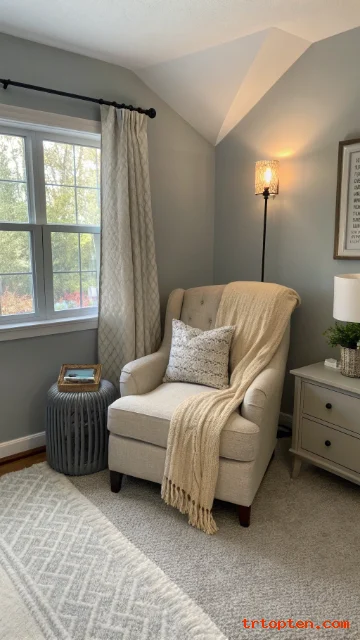 Add a beige accent chair for a cozy reading spot. Paint a small corner or alcove grey to define the nook. This creates a simple zone inside the bedroom.