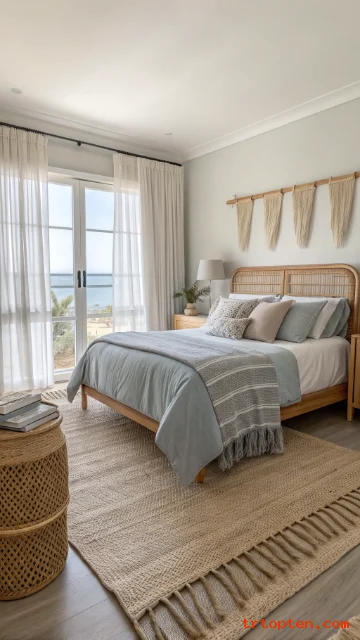 Use light beige walls and soft grey bedding for a coastal feel. Add natural textures like rattan and light wood. This style feels airy and relaxed.