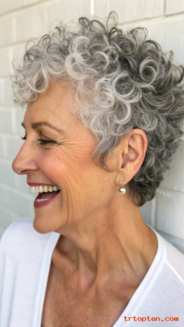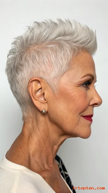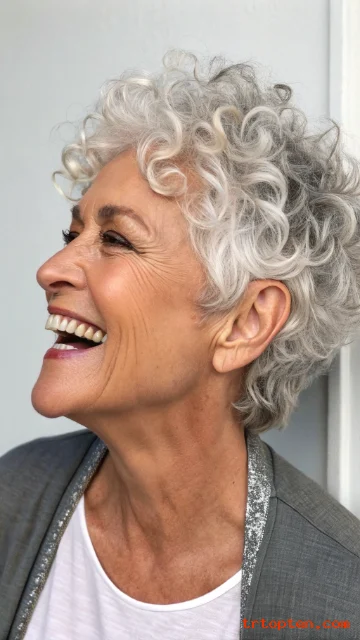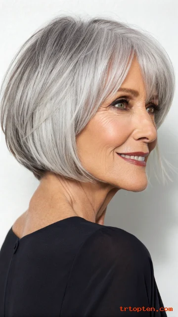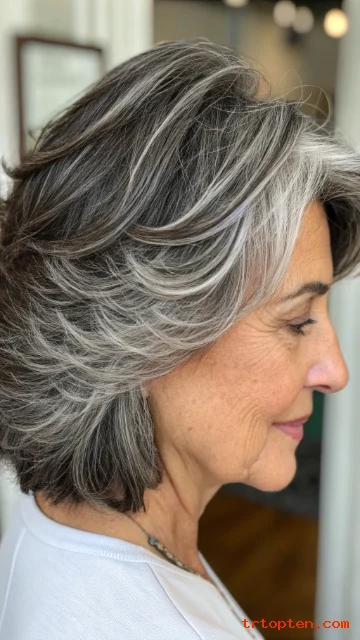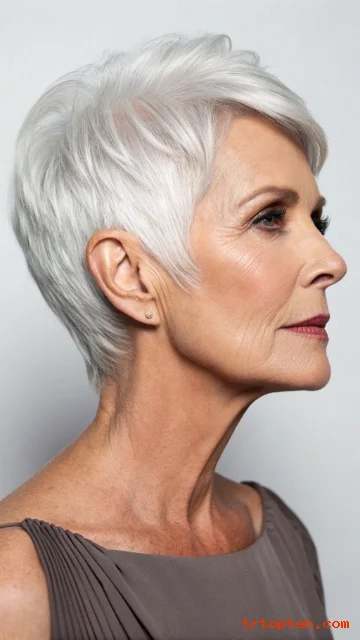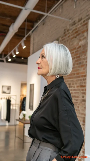 The short length highlights your facial structure and eyes. It makes a bold statement of self-assurance. This chic, low-maintenance cut proves that natural gray hair can be your most stunning accessory.