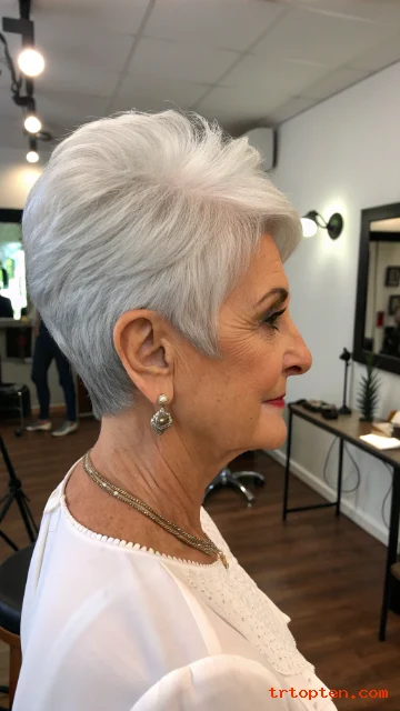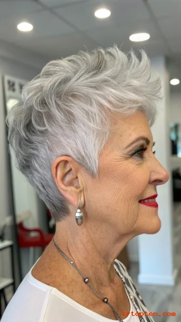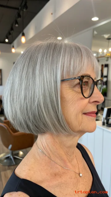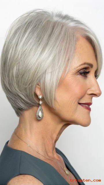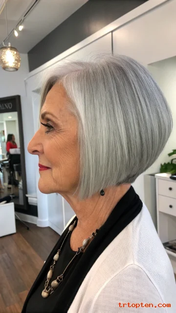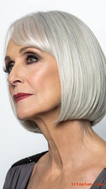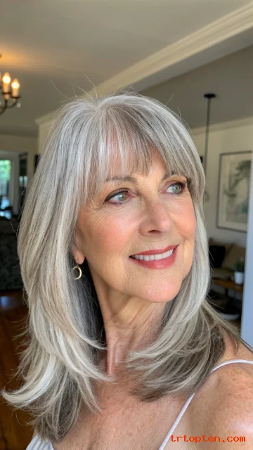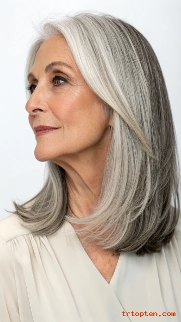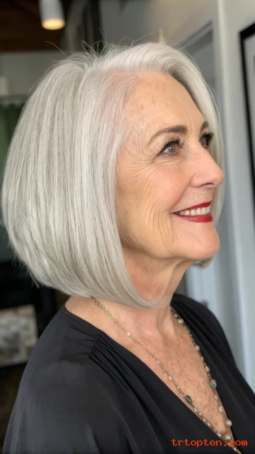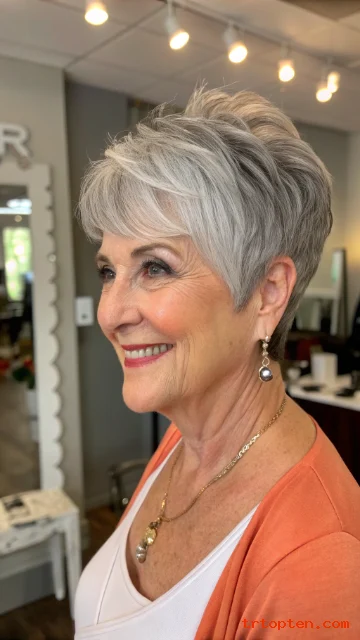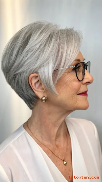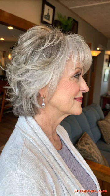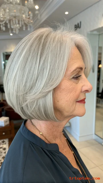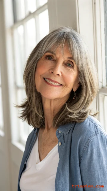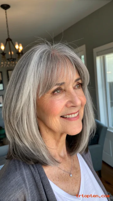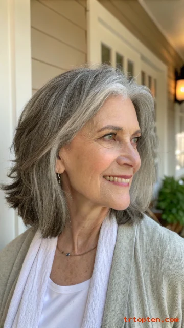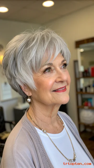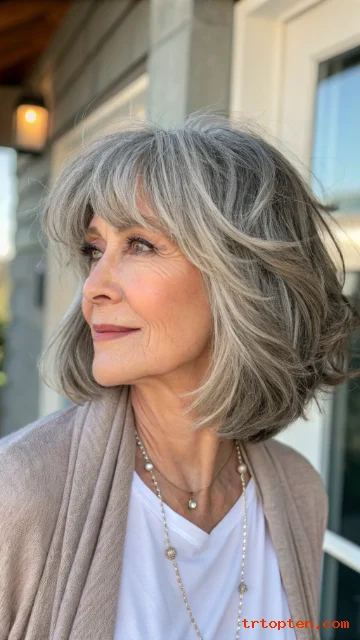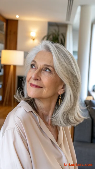 This hairstyle feels youthful but still elegant. It works well with natural gray and silver tones. It is a smart choice for women who want a low-maintenance haircut.