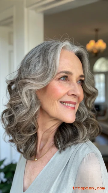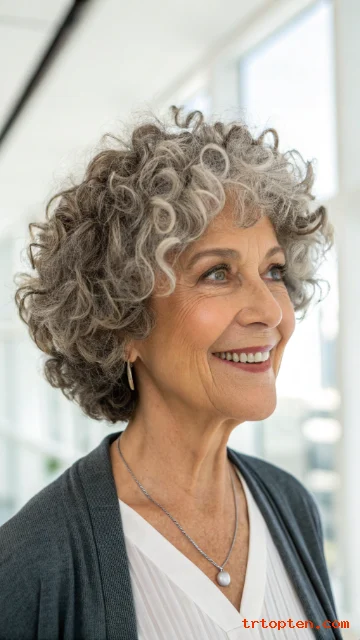 This hairstyle is perfect for women who enjoy gentle volume. It works well for natural curls or styled curls. It looks lovely with gray, white, or highlighted hair.
