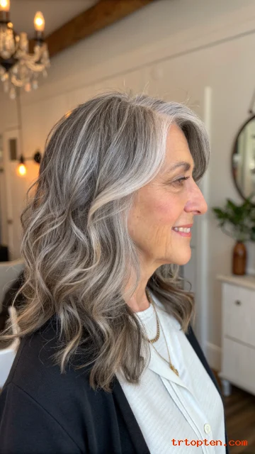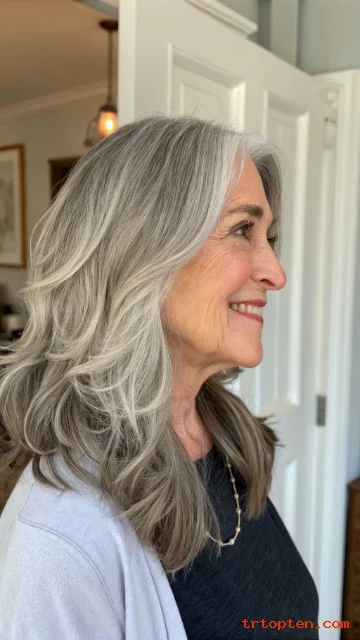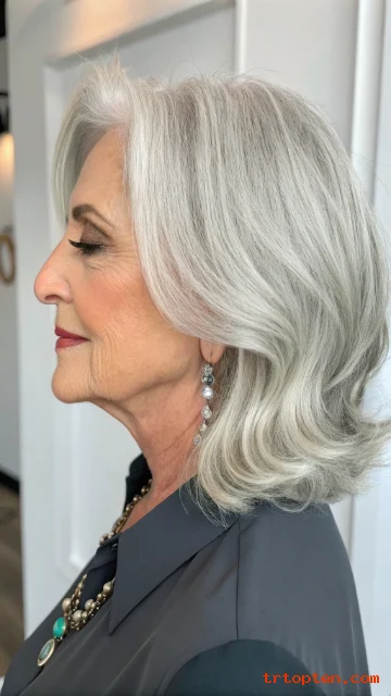 This haircut highlights natural silver tones beautifully. It gives the hair movement and a healthy appearance. Soft waves can make the silver shades stand out even more.