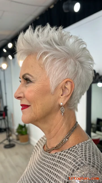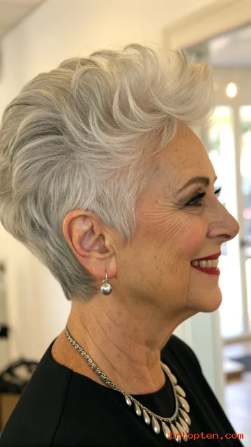 This style suits women who want a confident haircut. It works well with silver, white, and salt-and-pepper hair. It also highlights facial features very nicely.