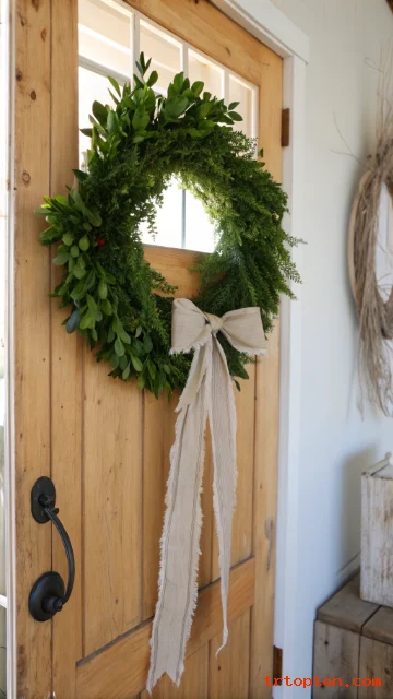 Boxwood looks clean, classic, and easy to style in farmhouse homes. A rustic ribbon keeps it from feeling too formal.
