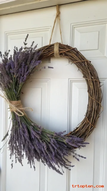 Wrap the wreath base with twine in a few spots for farmhouse texture. Keep the lavender slightly uneven so it looks natural and handmade.