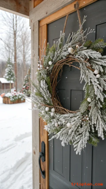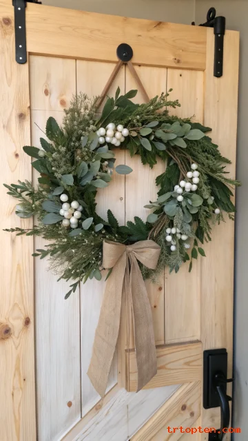 Add small pine sprigs and a few white berries for contrast. Keep the wreath simple so it looks natural and farmhouse-calm.