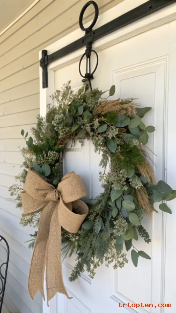 Eucalyptus brings a fresh green tone that still feels calm and farmhouse-friendly. A wide burlap bow adds cozy country charm without looking fussy.