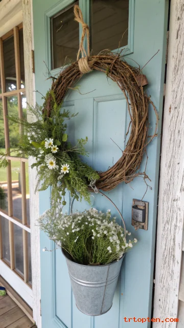 Use faux flowers for long-lasting color if the door gets direct sun. Tie the bucket on with thick twine for a true rustic look.