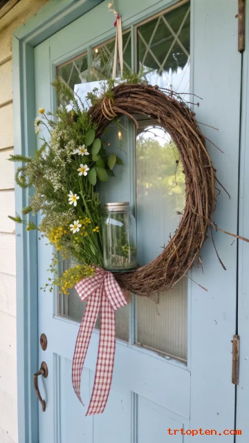 A mason jar is a farmhouse icon that looks charming on a wreath. It works best when it holds simple stems in a loose bundle.