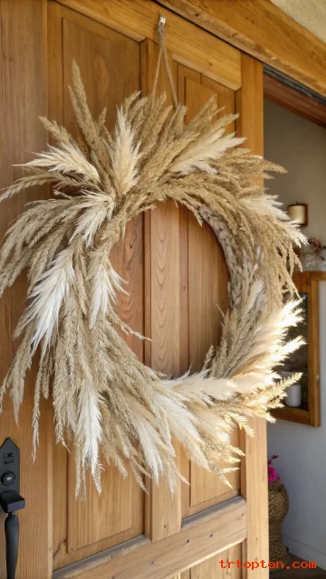 Choose pampas-style plumes and wheat-like stems for a layered shape. Keep the wreath slightly asymmetrical for a natural, airy finish.
