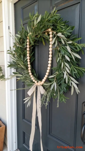 Olive branches look classic, airy, and timeless on any door color. Wooden beads add the warm farmhouse detail that makes it feel handcrafted.