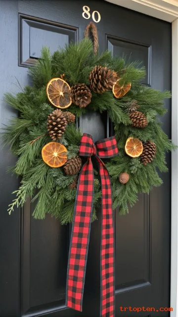 Use long ribbon tails so the bow feels relaxed and cozy. Add pinecones for texture, then tuck in a few dried orange slices for charm.