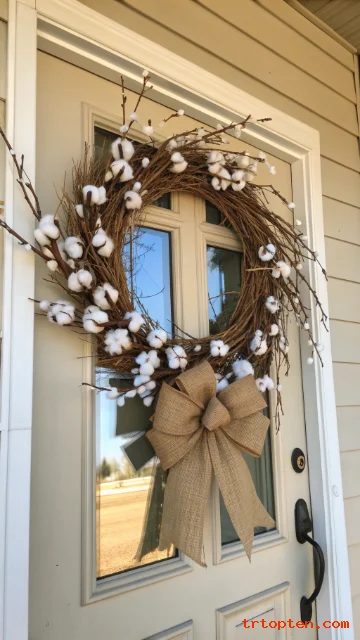 Tie on a simple burlap bow and let the cotton stay the star of the design. Place it near warm porch lights to make the white cotton glow at night.