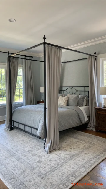 Keep the walls a pale grey to balance the canopy frame. Add black curtain rods or rings to match the bed. Choose sheer layers if you want light during the day.