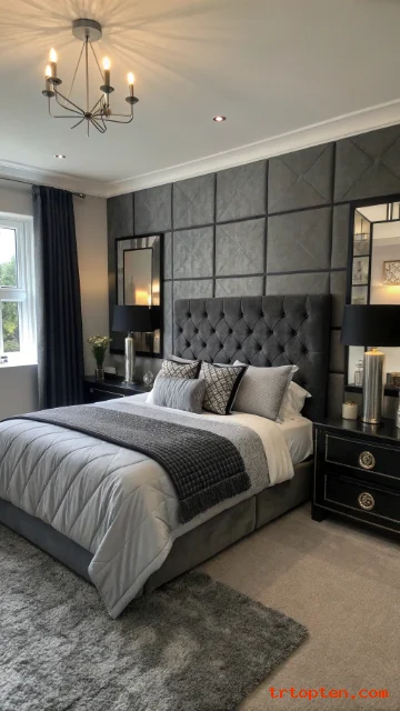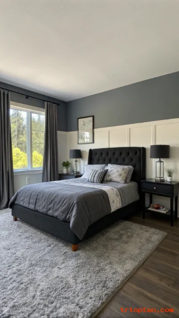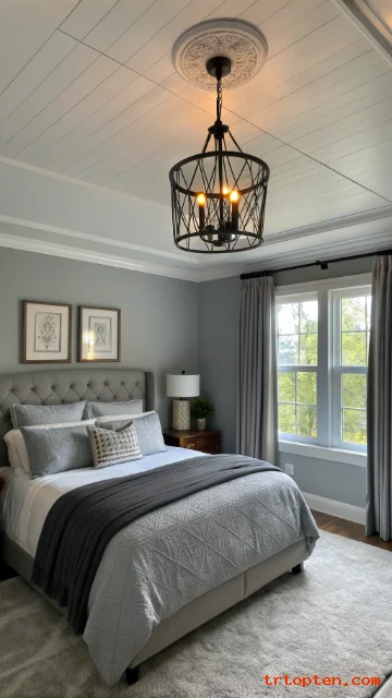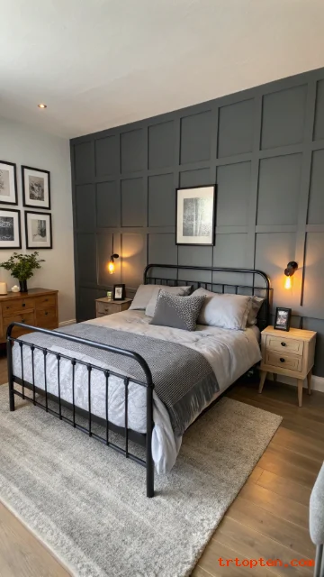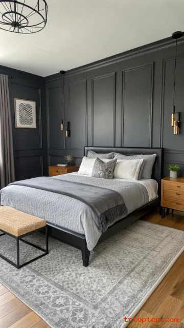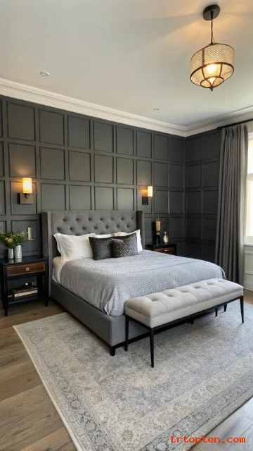 Choose a black headboard or black wall sconces to balance the paneling. Keep the ceiling and trim in a clean white if you want more brightness. This makes the grey feel fresh, not heavy.