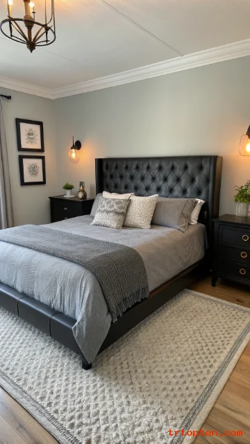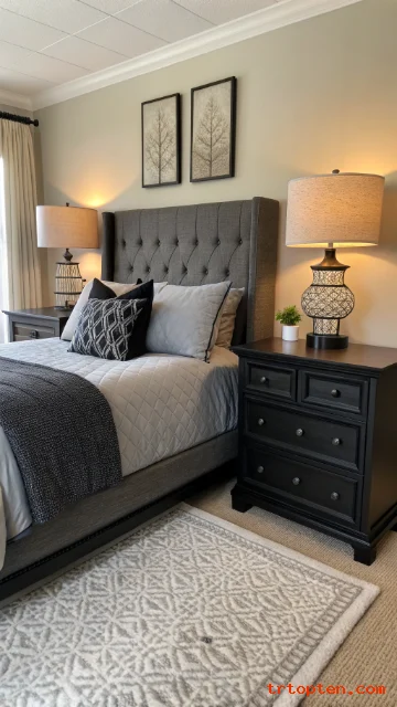 Use a charcoal wall or headboard and lighter bedding for contrast. Add black accents through lamps, frames, and hardware. Keep fabrics varied so the monochrome palette feels rich.