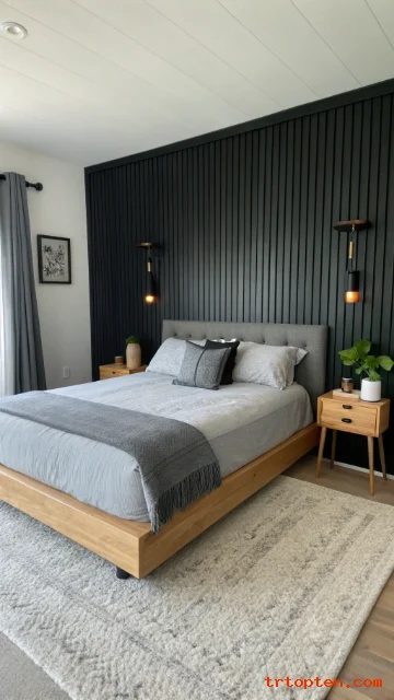A black slat wall behind the bed adds texture and depth. The vertical lines look modern and clean. Grey bedding softens the bold wall and keeps it restful.