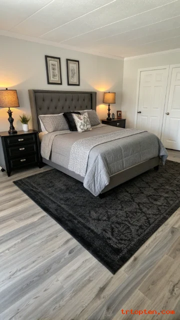 Grey wood flooring feels modern and easy to style. Add a black area rug under the bed for strong contrast. The rug frames the bed and adds comfort.